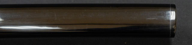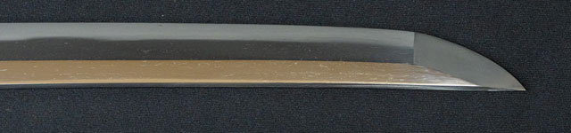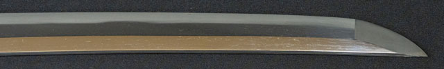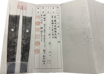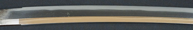 | 刀長 68.9cm(2尺2寸3分) 反り 2.1cm(7分) 元幅 3.13cm 先幅 2.48cm 元重 7.7mm 先重 5.8mm 刀身重量裸身820g 鞘を払って1,080g 茎 生 目釘穴 1 刃文 直刃 |