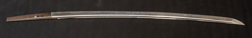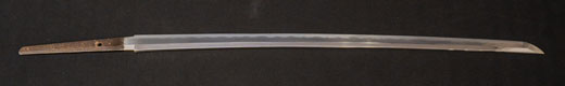 | 刀長 64.7cm(2尺1寸4分) 反り 1.7cm(5分3厘) 元幅 2.92 cm 先幅2.19cm 元重 6.6 mm 先重 5.4 mm 刀身重量 裸身 700g 鞘を払って ‐g 茎 生 目釘穴 1 刃文 直刃 |