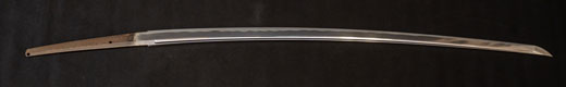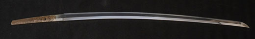 | 刀長 47.8cm(1尺5寸8分) 反り 1.3cm(4分3厘) 元幅 2.48cm 先幅 1.82cm 元重 5.8mm 先重 4.2mm重量裸身320g 茎 摺上 目釘穴 3刃文直刃 |