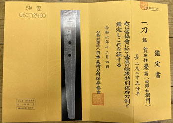 兼若三代四郎右衛門の作である。加賀の国にては兼若の刀を差していれば家老の娘も嫁に出来ると云われ位兼若の刀は大事にされていた。