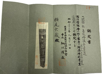 刀長 51.4cm(1尺7寸‐分) 反り 1.3cm(4分3厘) 元幅 3.12cm 先幅 2.36cm 元重 6.7mm 先重 5.2mm 刀身重量 裸身 560g