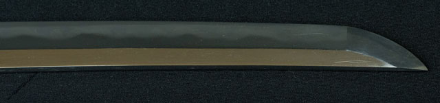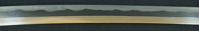 | 刀長 70.9cm(2尺3寸4分) 反り 1.6cm(5分3厘) 元幅 3.02cm 先幅 2.2cm 元重 7.5mm 先重 5.4mm 刀身重量 裸身 800g 鞘を払って 1,120g 茎 生 目釘穴 1 刃文 互ノ目丁子 |