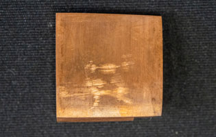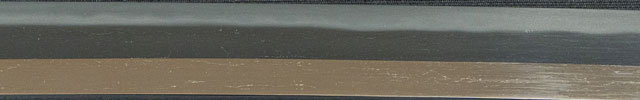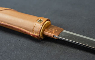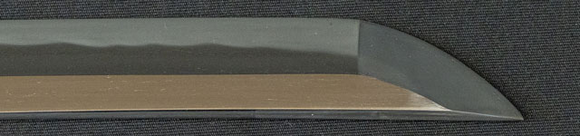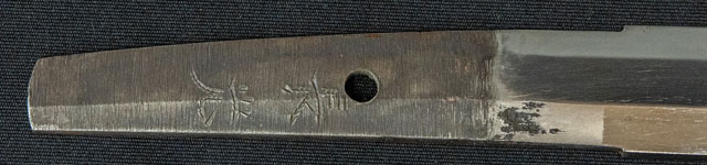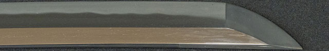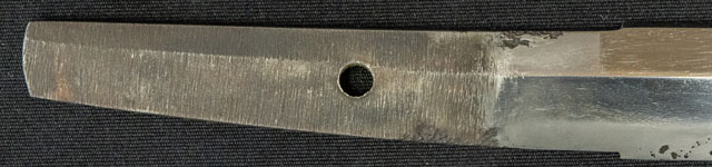 | 刀長 28.2cm(0尺9寸3分) 反り 0.2cm(0分9厘) 元幅 2.39cm 先幅 2.31cm 元重 5.4mm 先重 5.4mm 刀身重量裸身250g 鞘を払って-g 茎 生 目釘穴 1 刃文 小互ノ目乱 |