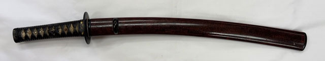 | 刀長 43.1cm(1尺4寸2分) 反り 0.8cm(2分6厘) 元幅 2.62cm 先幅 2.18cm 元重 5.2mm 先重 4.4mm 刀身重量裸身340g 鞘を払って520g 茎 摺上 目釘穴 2 刃文 大乱 |