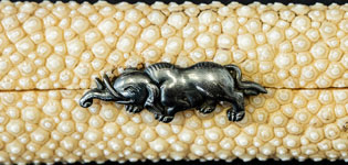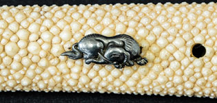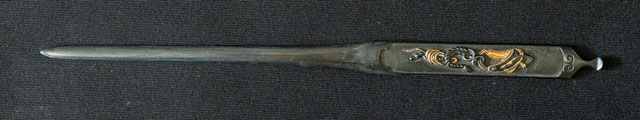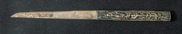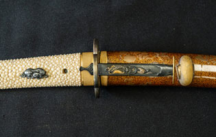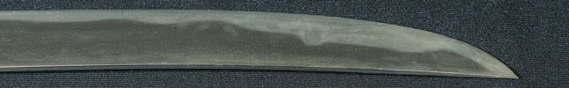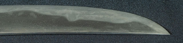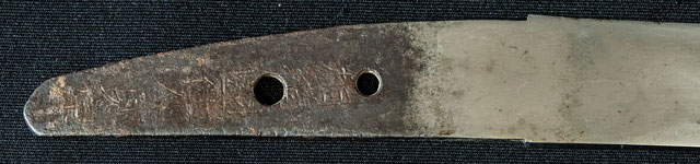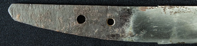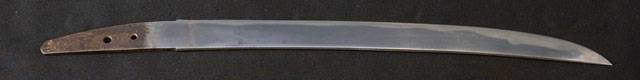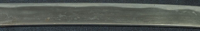 | 刀長 32.7cm(1尺0寸8分) 反り 0.cm(2分0厘) 元幅 2.61cm 先幅 2.43cm 元重 4.3mm 先重 4.2mm 刀身重量裸身200g 鞘を払って400g 茎 生 目釘穴 2 刃文 乱刃 |