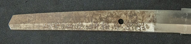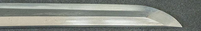 | 刀長 64.7cm(2尺1寸4分) 反り 1.7cm(5分3厘) 元幅 2.92cm 先幅 2.19 cm 元重 6.6mm 先重 5.4 mm 刀身重量裸身700g 鞘を払って-g 茎 生 目釘穴 1 刃文 直刃 |