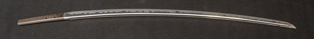| 刀長 66.7cm(2尺2寸-分) 反り 1.4cm(4分6厘) 元幅 2.82cm 先幅 2.16cm 元重 6.9mm 先重 5.3mm 刀身重量裸身-g 鞘を払って-g 茎 摺上 目釘穴 2 刃文 乱刃 |