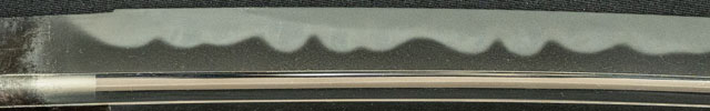 地金小板肌細かく詰み写り立つ。出来良し。刃紋腰の開いた互ノ目に丁字刃交じり葉さかんに入る。 |