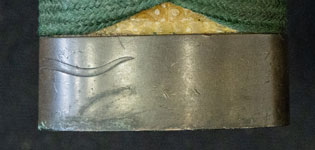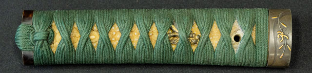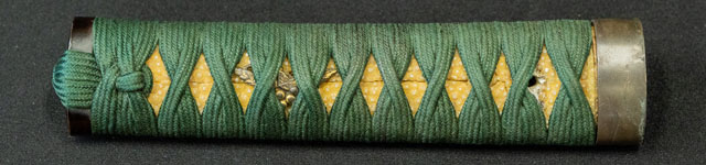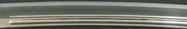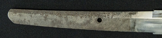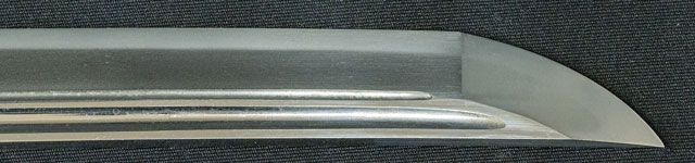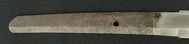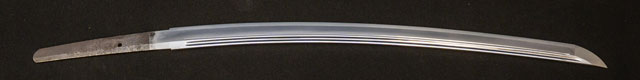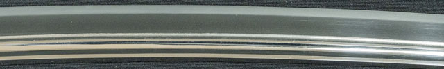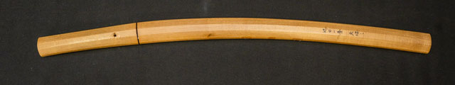 | 刀長 48.5cm(1尺6寸-分) 反り 1.7cm(5分6厘) 元幅 2.62cm 先幅 2.26cm 元重 6.0mm 先重 4.6mm 刀身重量裸身420g 鞘を払って640g 茎 生 目釘穴 1 刃文 直刃 |