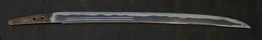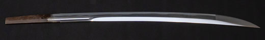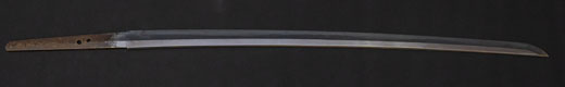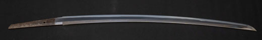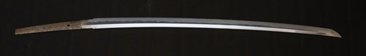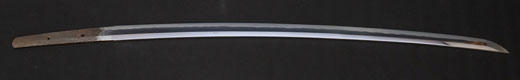 | 刀長 68.4cm(2尺2寸6分) 反り 1.3cm(4分3厘)元幅 3.00cm 先幅 2.31cm 元重 7.0mm 先重 5.7 mm 刀身重量 730g 鞘を払って 1,050g 茎 茎区送り 目釘穴 2 刃文 直刃 |