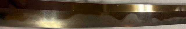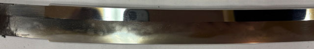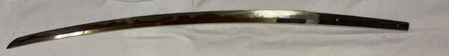 | 刀長 64.5cm(2尺1寸3分) 反り 2.0cm(6分5厘) 元幅 2.73cm 先幅 2.18cm 元重 5.2mm 先重 4.3mm 刀身重量裸身600g 茎 摺上 目釘穴 2 刃文 互ノ目丁子 |