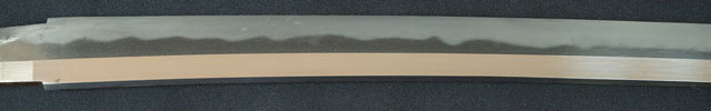 | 刀長 68.8cm(2尺2寸7分) 反り 1.36cm(4分4厘) 元幅 3.22cm 先幅 2.46cm 元重 6.9mm 先重 5.4mm 刀身重量裸身730g 鞘を払って-g 茎 生 目釘穴 1 刃文 互ノ目丁字 |