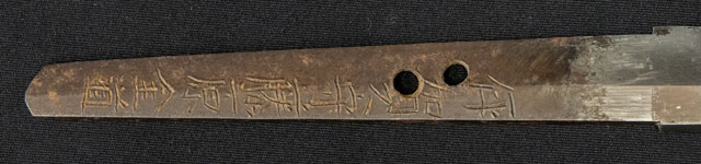 | 刀長 52.0cm(1尺7寸1分) 反り 0.8cm(2分4厘) 元幅 2.49cm 先幅 1.87cm 元重 5.5mm 先重 4.4mm 刀身重量裸身350g 鞘を払って580g 茎 生 目釘穴 1 刃文 のたれ |
