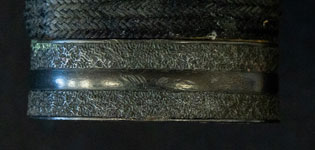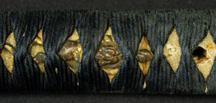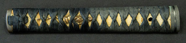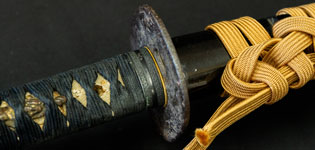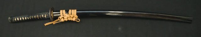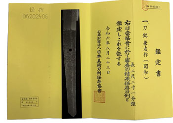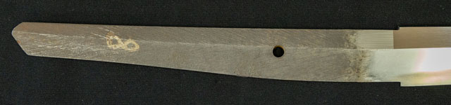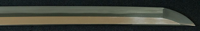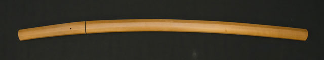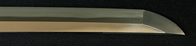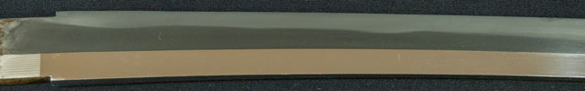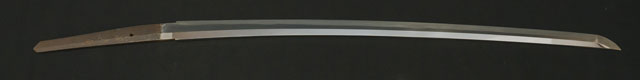 | 刀長 67.1cm(2尺2寸1分) 反り 1.4cm(4分6厘) 元幅 3.26cm 先幅 2.38cm 元重 7.5mm 先重 5.0mm 刀身重量 裸身 750g 鞘を払って1,100g 茎 生 目釘穴 1 刃文 直刃 |