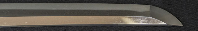 | 刀長 63.7cm(2尺1寸-分) 反り 1.7cm(5分6厘) 元幅 3.06cm 先幅 2.41cm 元重 8.6mm 先重 6.3mm 刀身重量裸身720g 鞘を払って1,020g 茎 生 目釘穴 1 刃文 元 三本杉 物打 直刃 |