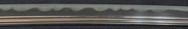| 刀長 74.9cm(2尺4寸7分) 反り 2.2cm(7分2厘) 元幅 3.19cm 先幅 2.31cm 元重 7.2mm 先重 4.5mm 刀身重量裸身788g 鞘を払って-g 茎 生 目釘穴 1 刃文 互ノ目丁字 |