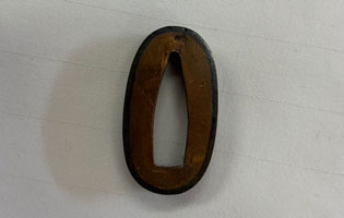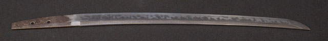 | 刀長 43.1cm(1尺4寸2分) 反り 0.8cm(2分6厘) 元幅 2.62cm 先幅 2.18cm 元重 5.2mm 先重 4.4mm 刀身重量裸身340g 鞘を払って520g 茎 摺上 目釘穴 2 刃文 大乱 |