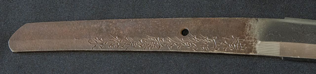 | 刀長 69.8cm(2尺3寸0分) 反り 1.7cm(5分6厘) 元幅 3.02cm 先幅 2.33cm 元重 6.2mm 先重 4.9mm 刀身重量裸身680g 鞘を払って1.020g 茎 生 目釘穴 1 刃文 互ノ目丁字 |
